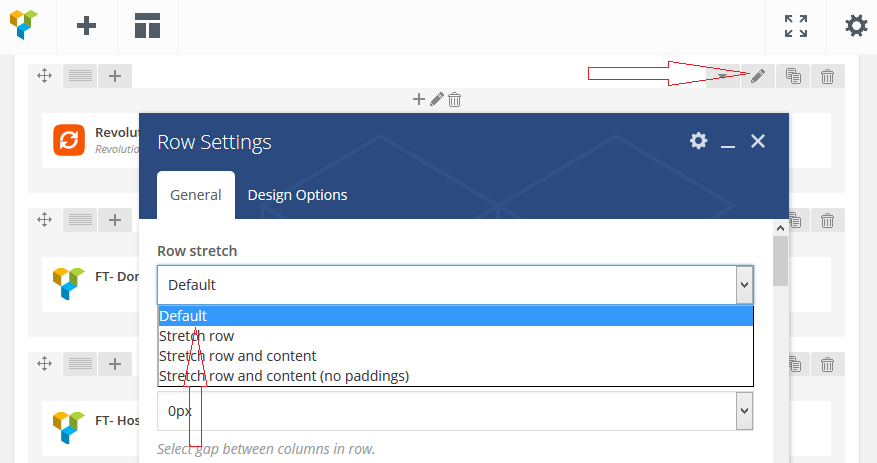 From the Website Width option in your Theme-Options you can choose Full-Width or Boxed Style. It is important to remember that – If you choose Boxed Style, do not forget to edit the Rows of your pages. Click on the edit icon of the Rows and select Default from the drop-down options of Row stretch. Otherwise you may see the pages sections are not properly styled into the Box.